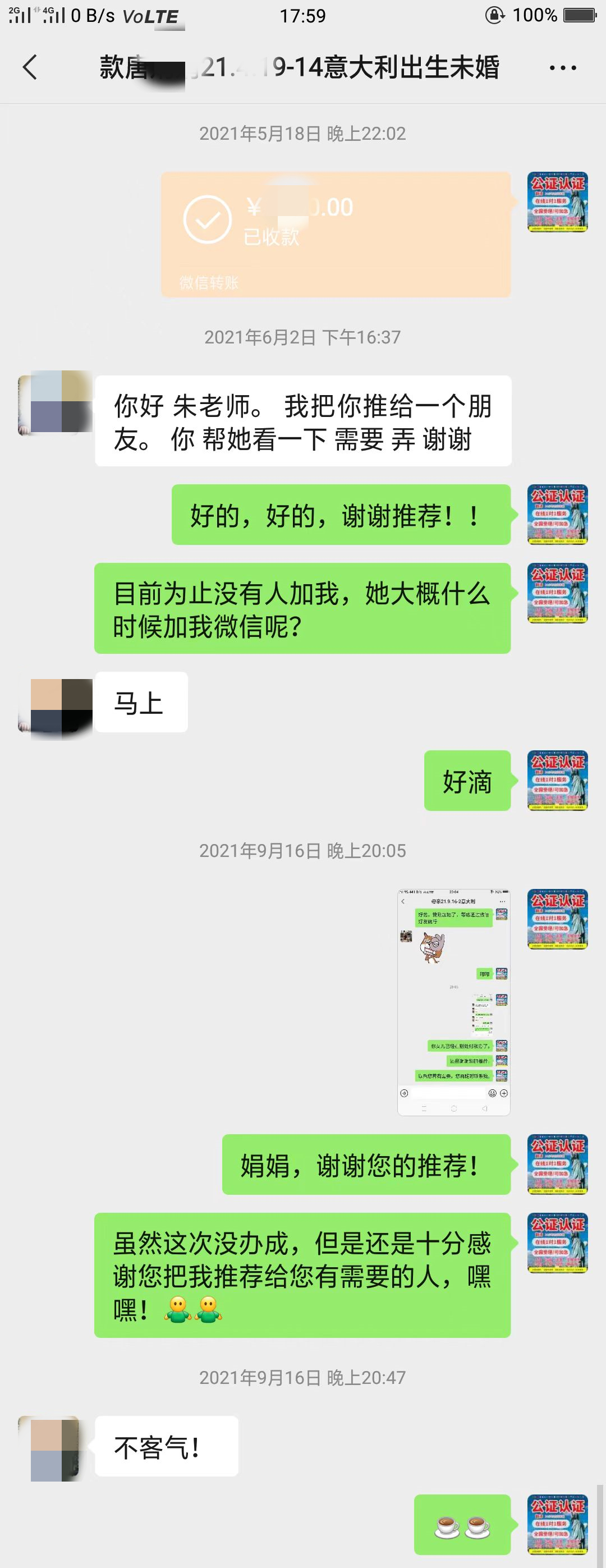 和男朋友在意大利结婚的唐小姐,俩人要一起办理出生公证意大利双认证和未婚公证意大利单认证,男朋友让家人在老家办了,但她的没法请家人办,则找到了我们。中意语的出生公证,我们给她加急最快1个工作日出了,她开心得很,后续办理也很顺利。这不,她后续还向我推荐了她的朋友: