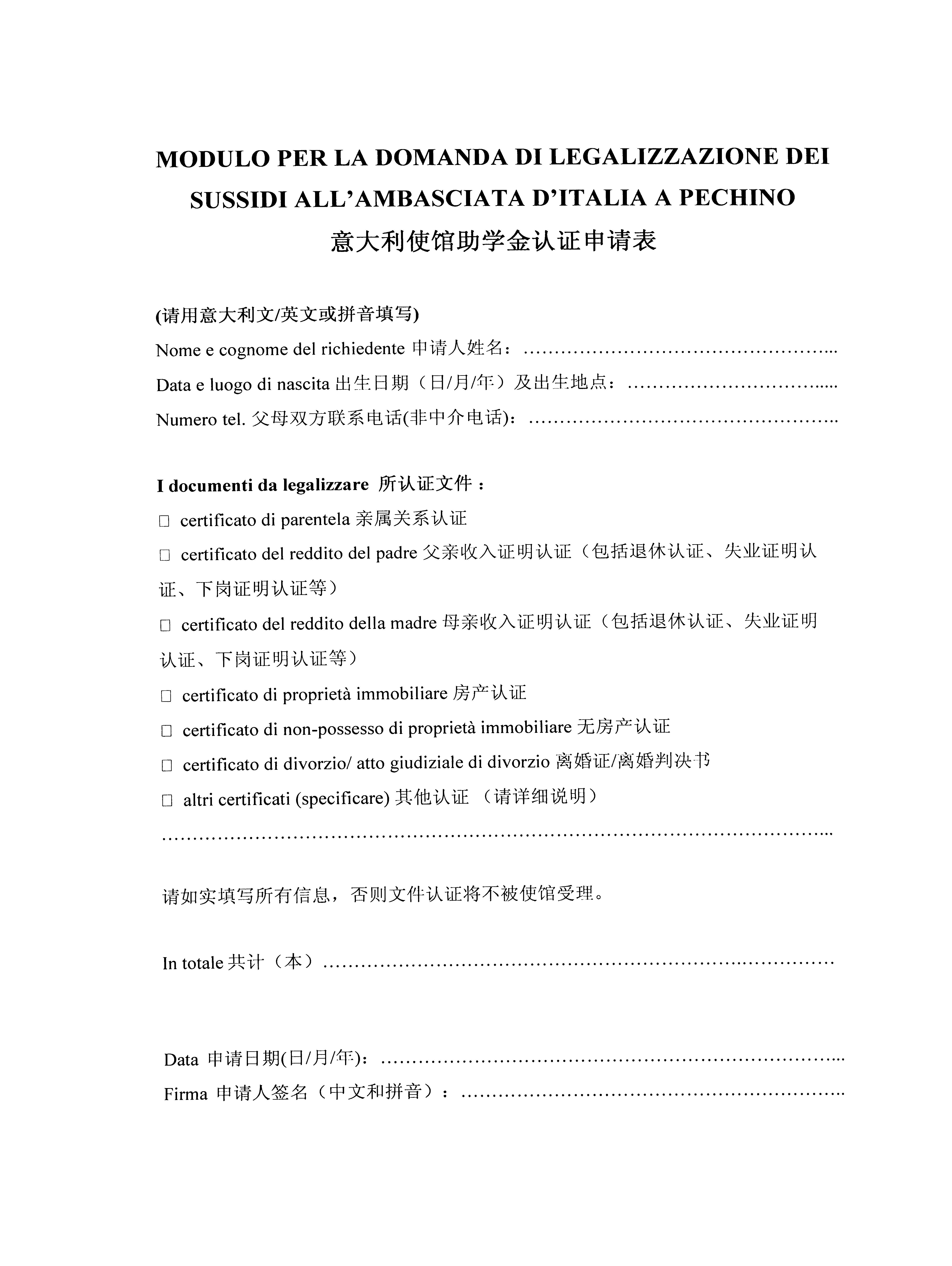 意大利 使馆助学金认证申请表